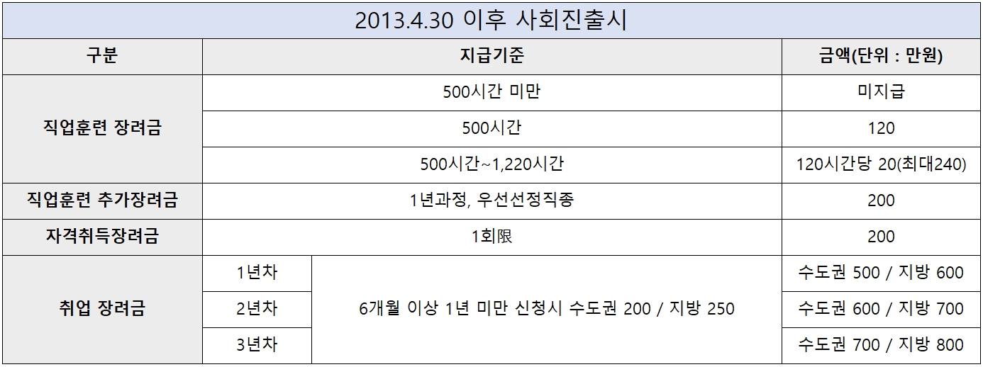 기본 교육을 받고 정착기본금이 지급된 후 사회 진출이 진행된 탈북자는 별도로 정착지원금이 지급되는데 거주지보호기간 5년동안 6개월 이상 동일한 업체에서 근무했을 경우 위 표에 나온대로 최대 3년까지 지급이 이루어지며 출산이 이루어졌을 경우 최대 2년의 범위 내에서 출산횟수별 1년씩 신청기간이 연장됩니다. 2014년 11월 29일 이후 입국하여 보호대상자로 결정되었을 경우 직업훈련 장려금 및 자격 취득 장려금이 적용되지 않기도 합니다.